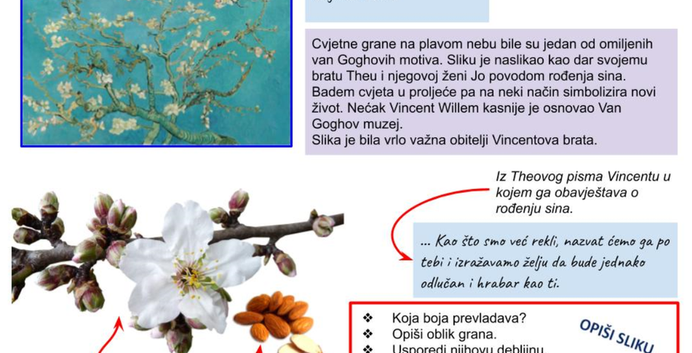 Učenici su dobili domaći zadatak pripremiti se za sat tako da posjete razrednu mrežnu stranicu (https://veseliradoznalci.wixsite.com/cetvrti-d-razred/vincent-van-gogh) i preko ponuđene poveznice (Europeana) posjete kolekciju nekih van Goghovih radova. Većim se dijelom radi o crtežima i manje poznatim djelima što će omogućiti uvid u umjetnikov razvoj s obzirom da se u ovom projektu fokusiramo na djela iz posljednje faze.